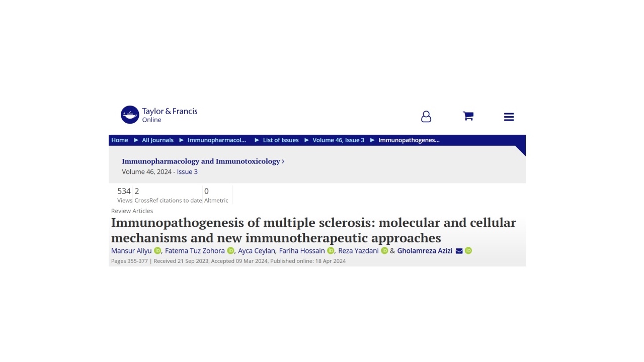 [4]AliyuM,ZohoraFT,CeylanA,HossainF,YazdaniR,AziziG.Immunopathogenesisofmultiplesclerosis:molecularandcellularmechanismsandnewimmunotherapeuticapproaches.ImmunopharmacolImmunotoxicol.2024Jun;46(3):355-377.doi:10.1080/08923973.2024.2330642.Epub2024Apr18.PMID:38634438.