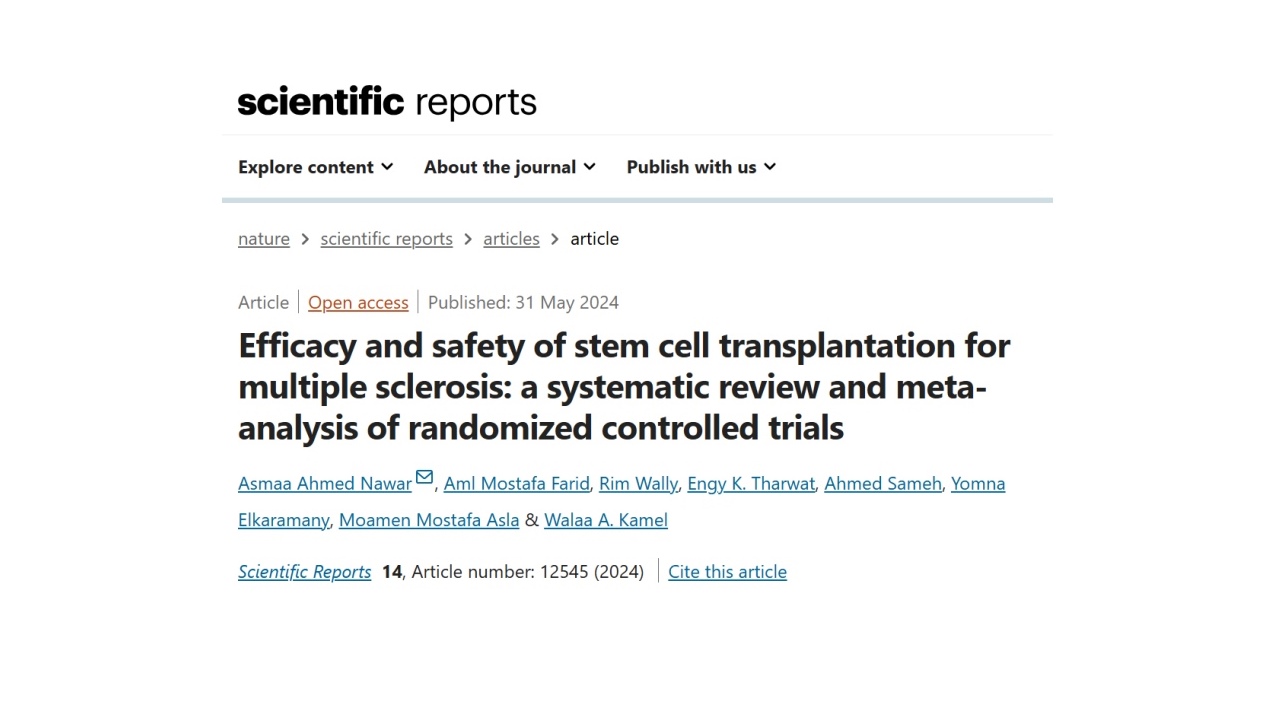 [5]Nawar,A.A.,Farid,A.M.,Wally,R.etal.Efficacyandsafetyofstemcelltransplantationformultiplesclerosis:asystematicreviewandmeta-analysisofrandomizedcontrolledtrials.SciRep14,12545(2024).https://doi.org/10.1038/s41598-024-62726-4