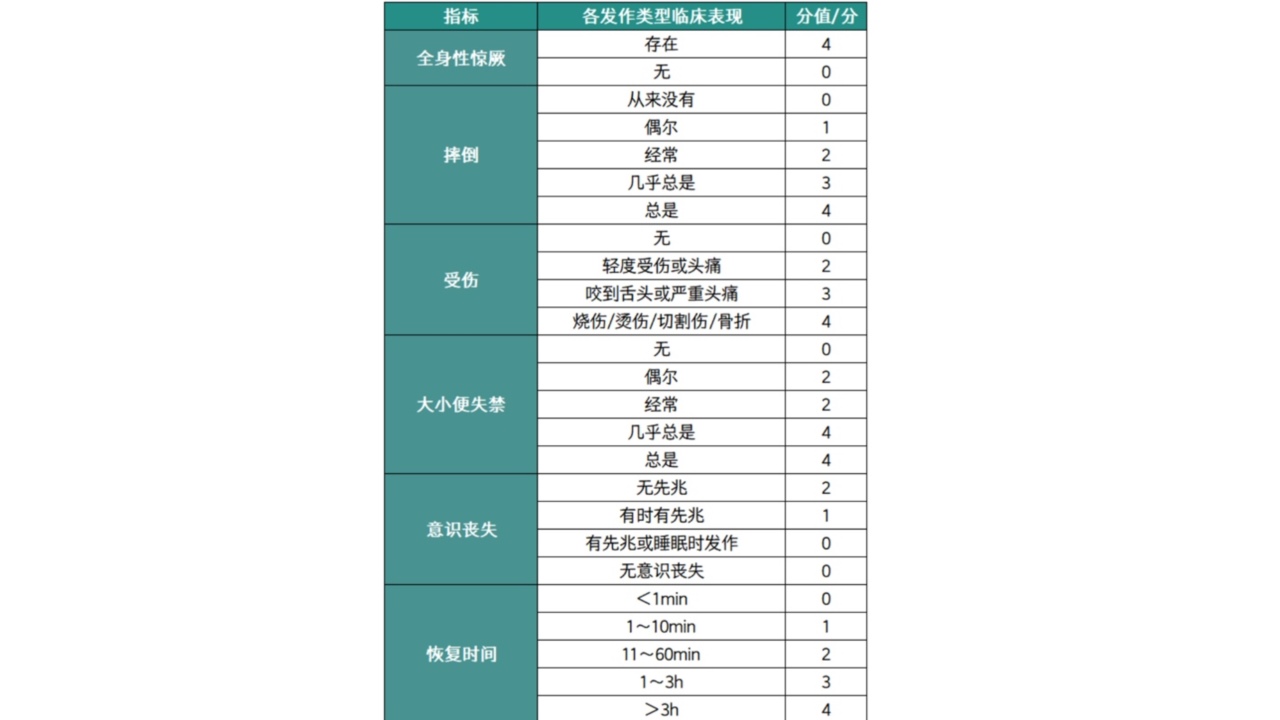 NHS3量表涵盖了多种临床表现,包括全身性惊厥、摔倒、受伤、大小便失禁、意识丧失以及恢复时间。根据这些临床表现的出现频率和严重程度,量表为每一项指标分配了相应的分值(详见表1)。