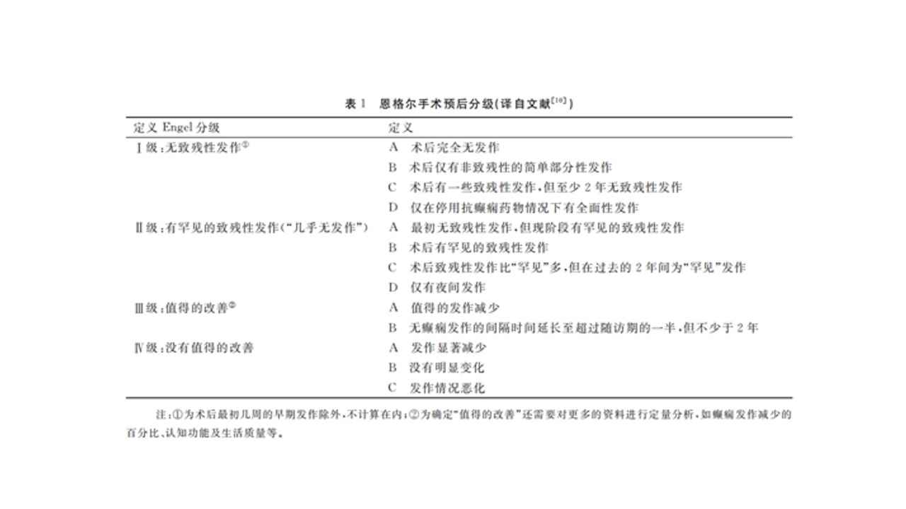 恩格尔手术预后分级(Engel’sclassificationofpostoperativeoutcome,恩格尔手术预后分级,简称恩格尔分级,习惯称为Engel分级)将癫痫手术预后分为无致残性发作(Ⅰ级)、有罕见的致残性发作(Ⅱ级)、值得的改善(Ⅲ级)和不值得的改善(Ⅳ)4个等级。