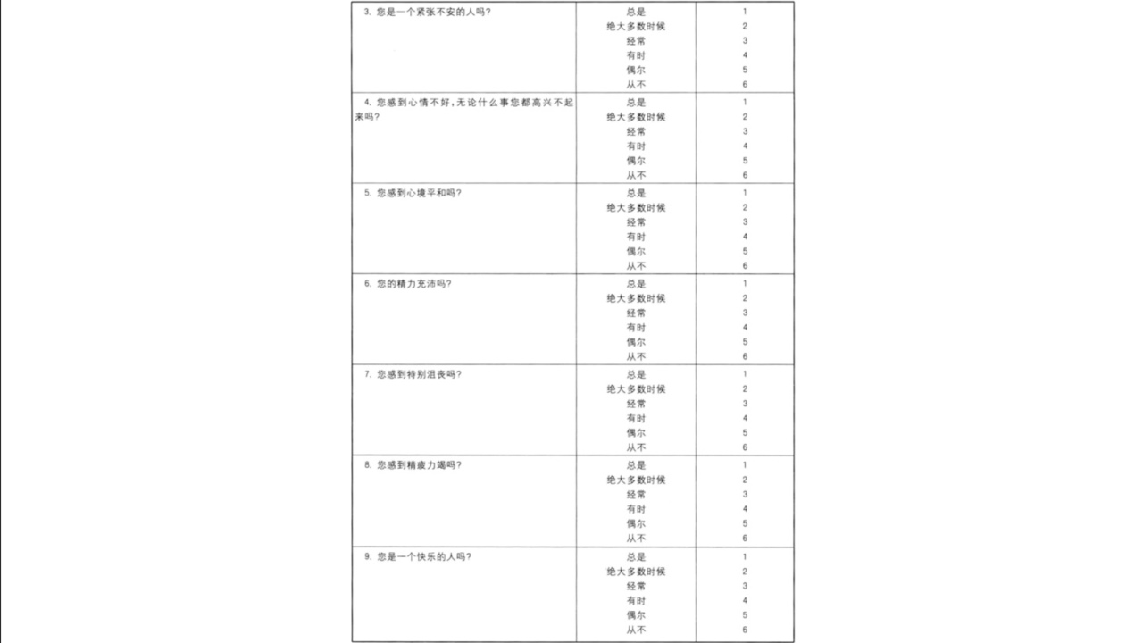 2、该测试内容涵盖了上一个月内的生活感受。