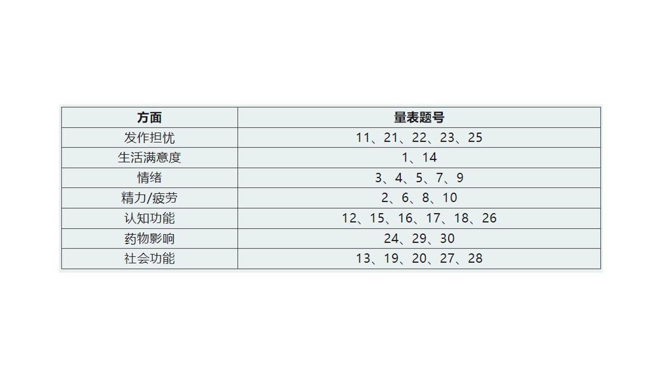 它可以快速全面地评估成年癫痫患者关心的与健康相关的主要生活质量问题,并可用于临床试验以评价治疗方案变化后患者的反应。