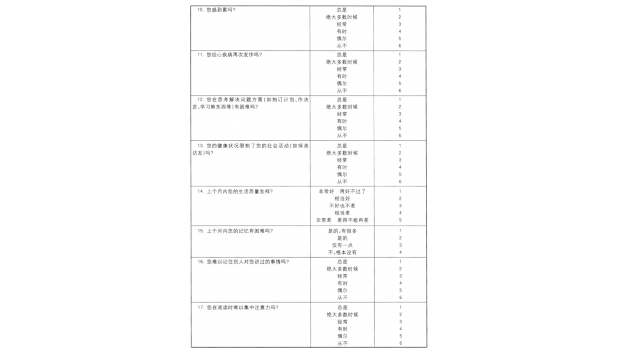 中文版本由南方医科大学(原中国人民解放军第一军医大学)的任晓琳等人修订,增加了饮食和自我健康感觉两个问题,以适应我国实际情况。