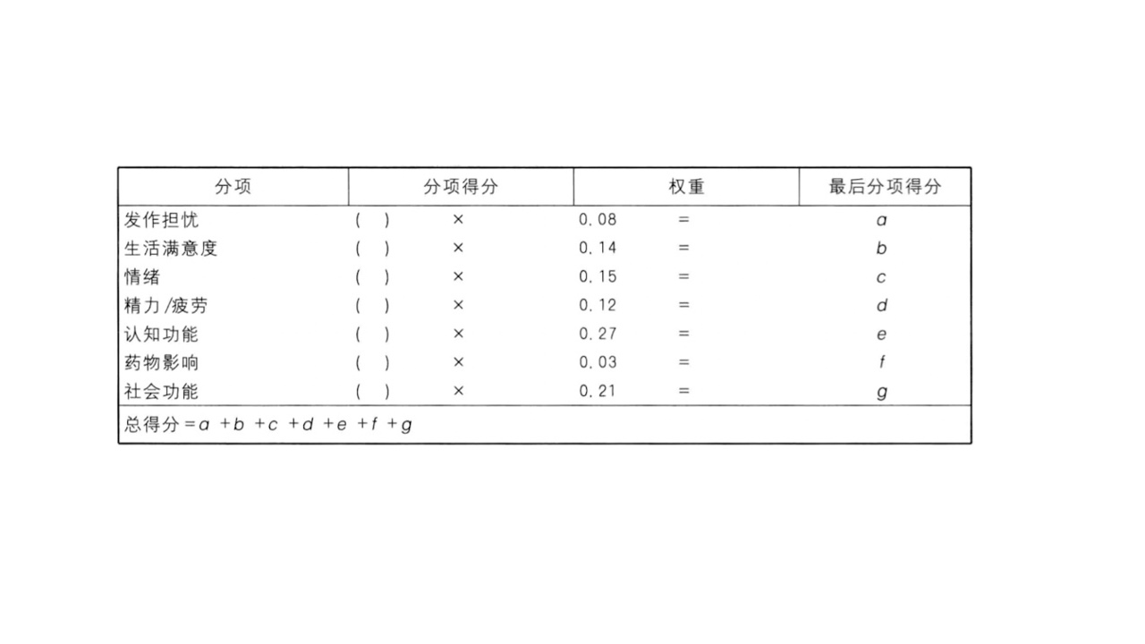 表8:QOLIE-31量表各方面的得分权重及总得分的计算方法