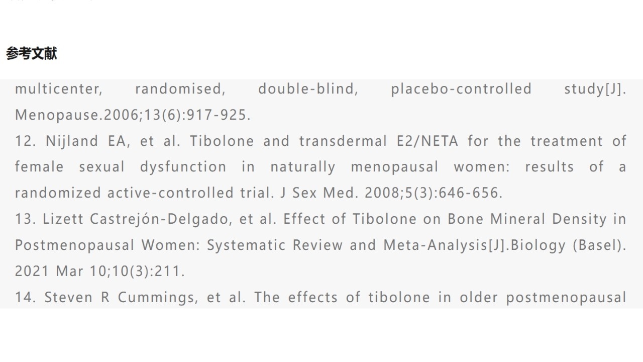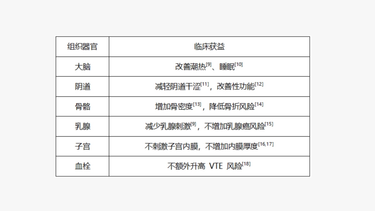 多项临床研究结果显示,替勃龙在不同组织中存在临床获益(见表):