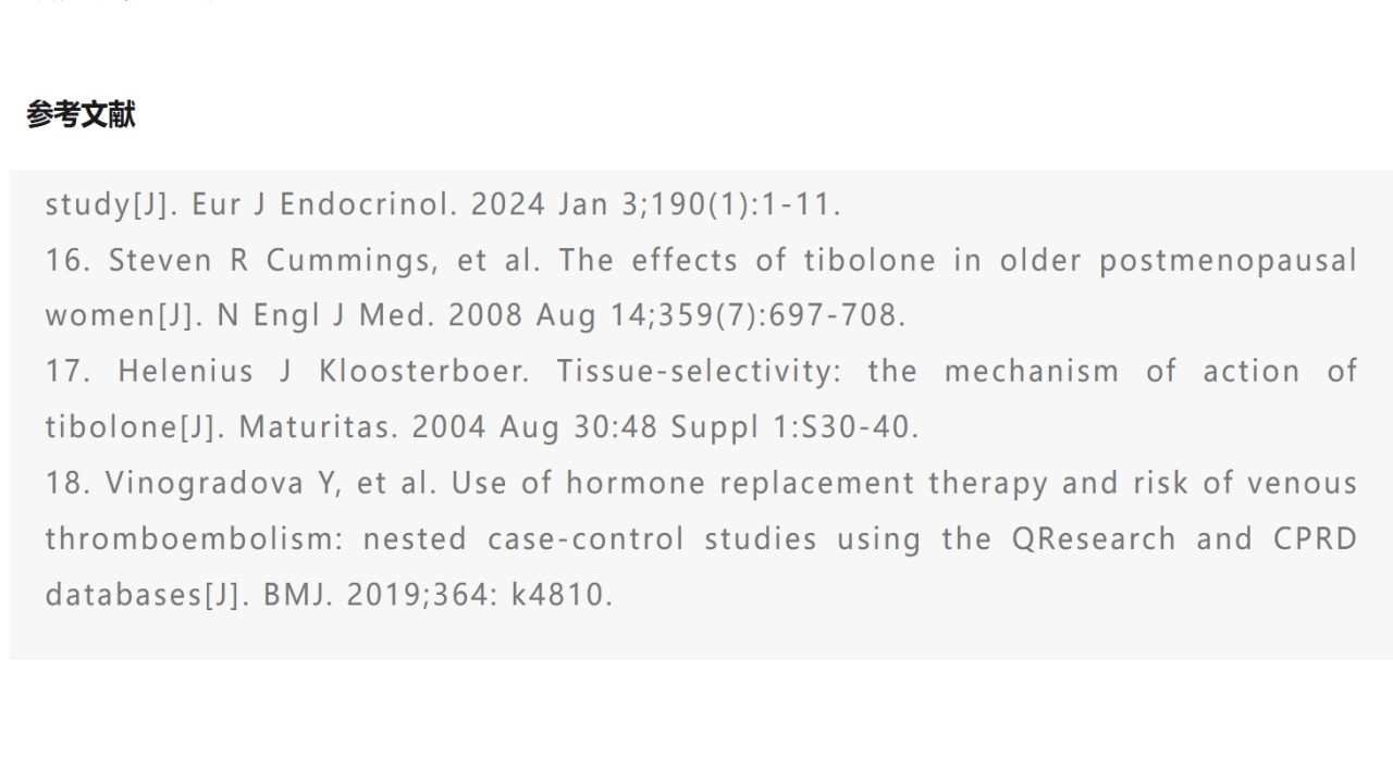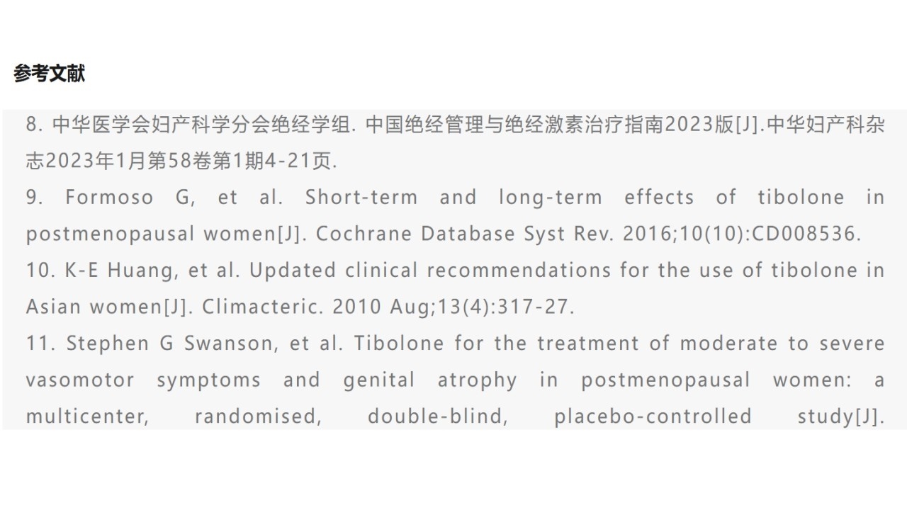 2023版《中国绝经管理与绝经激素治疗指南》[8]指出,替勃龙适用于不愿出现月经样出血的绝经后女性,以及合并子宫肌瘤、子宫内膜异位症或子宫腺肌病的患者。
