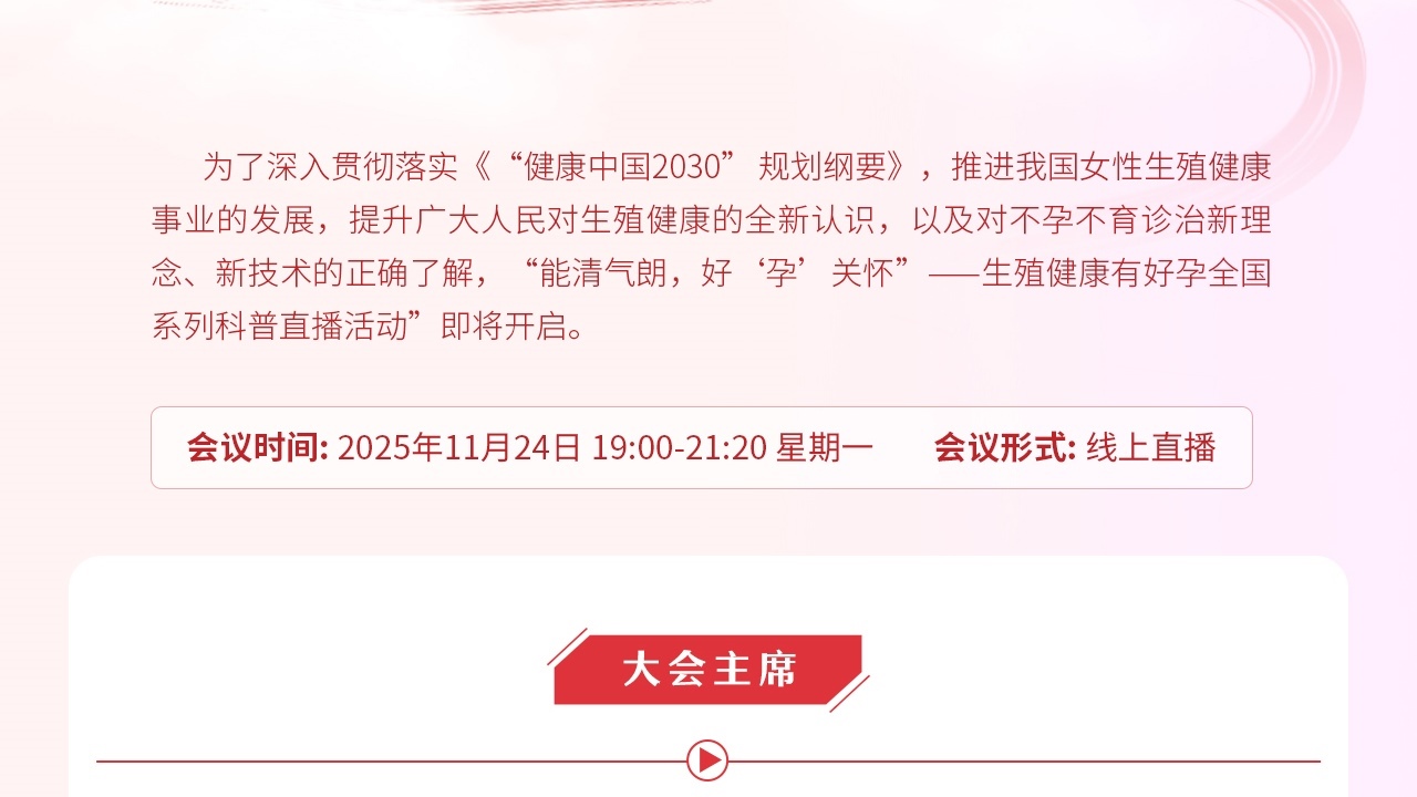 为了深入贯彻落实《“健康中国2030”规划纲要》,推进我国女性生殖健康事业的发展,提升广大人民对生殖健康的全新认识,以及对不孕不育诊治新理念、新技术的正确了解,2025年11月24日19:00-21:20“能清气朗,好‘孕’关怀——生殖健康有好孕全国系列科普直播活动”线上开讲,敬请关注。