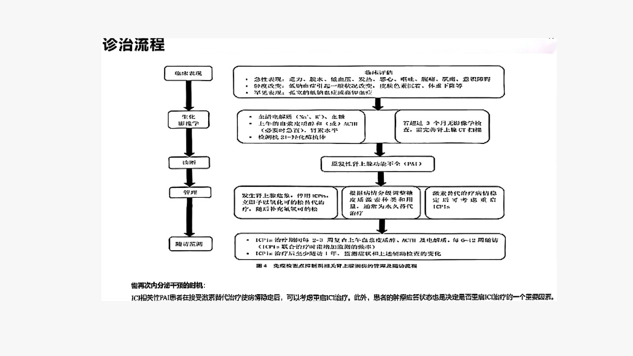 肾上腺功能不全是ICIs治疗中较为罕见的内分泌irAE,临床表现常与垂体炎类似,严重者可进展为肾上腺危象。诊断主要依据清晨血清皮质醇和促肾上腺皮质激素(ACTH)水平,必要时行ACTH刺激试验以与继发性肾上腺皮质功能减退鉴别;病因鉴别则需借助抗21-羟化酶抗体检测及肾上腺CT检查。
