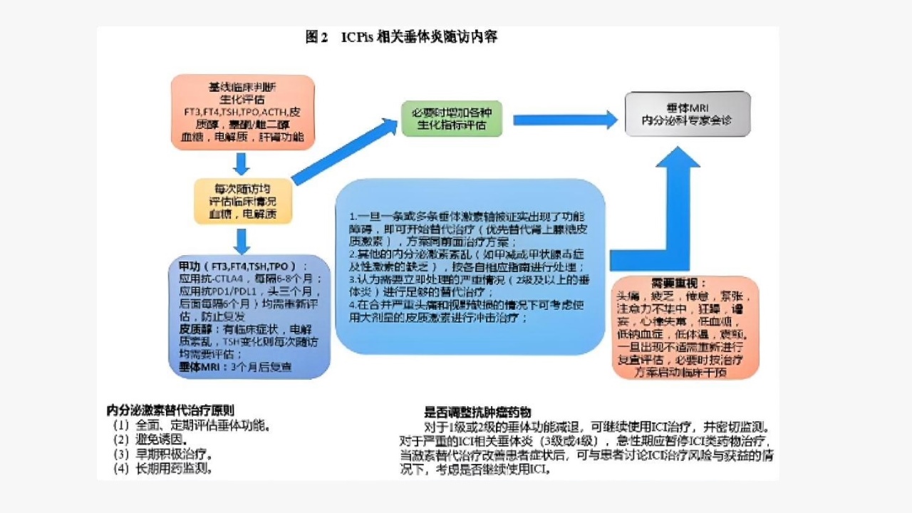 临床上需综合患者ICI治疗药物及所致垂体功能异常的发生率、影像学检查(MRI最敏感)、外周血实验室检查评估垂体功能等方面进行综合诊断,同时需与内分泌科医生进行多学科协作诊治并随访。