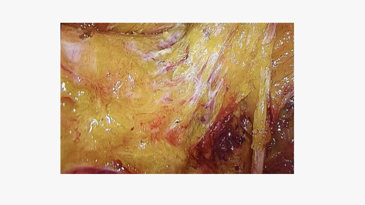 值得探讨的是拉氏间隙位于泌尿生殖膈筋膜的前、下方,是骶前间隙中泌尿生殖膈筋膜下方、骶前筋膜上方间隙的延续,泌尿生殖膈筋膜也就是拉氏间隙和冈林间隙之间的输尿管系膜的延续(图7),在手术中有重要的意义,团队正在对该问题深入学习研讨。