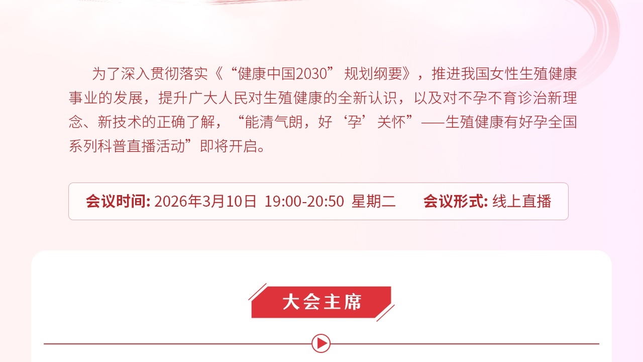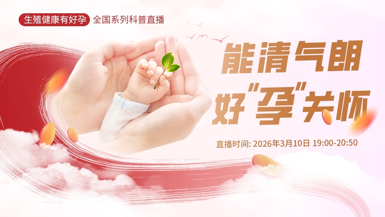 为了深入贯彻落实《“健康中国2030”规划纲要》,推进我国女性生殖健康事业的发展,提升广大人民对生殖健康的全新认识,以及对不孕不育诊治新理念、新技术的正确了解,2026年3月10日19:00-20:50“能清气朗,好‘孕’关怀——生殖健康有好孕全国系列科普直播活动”线上开讲。