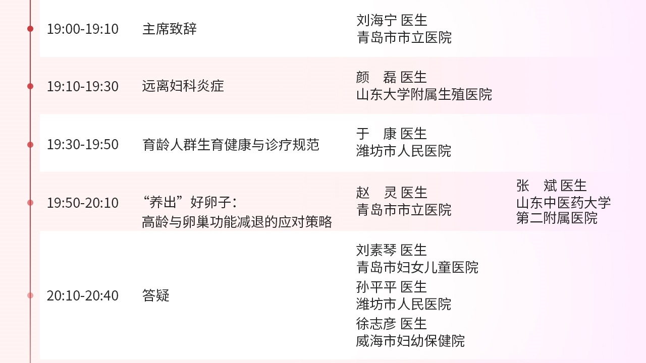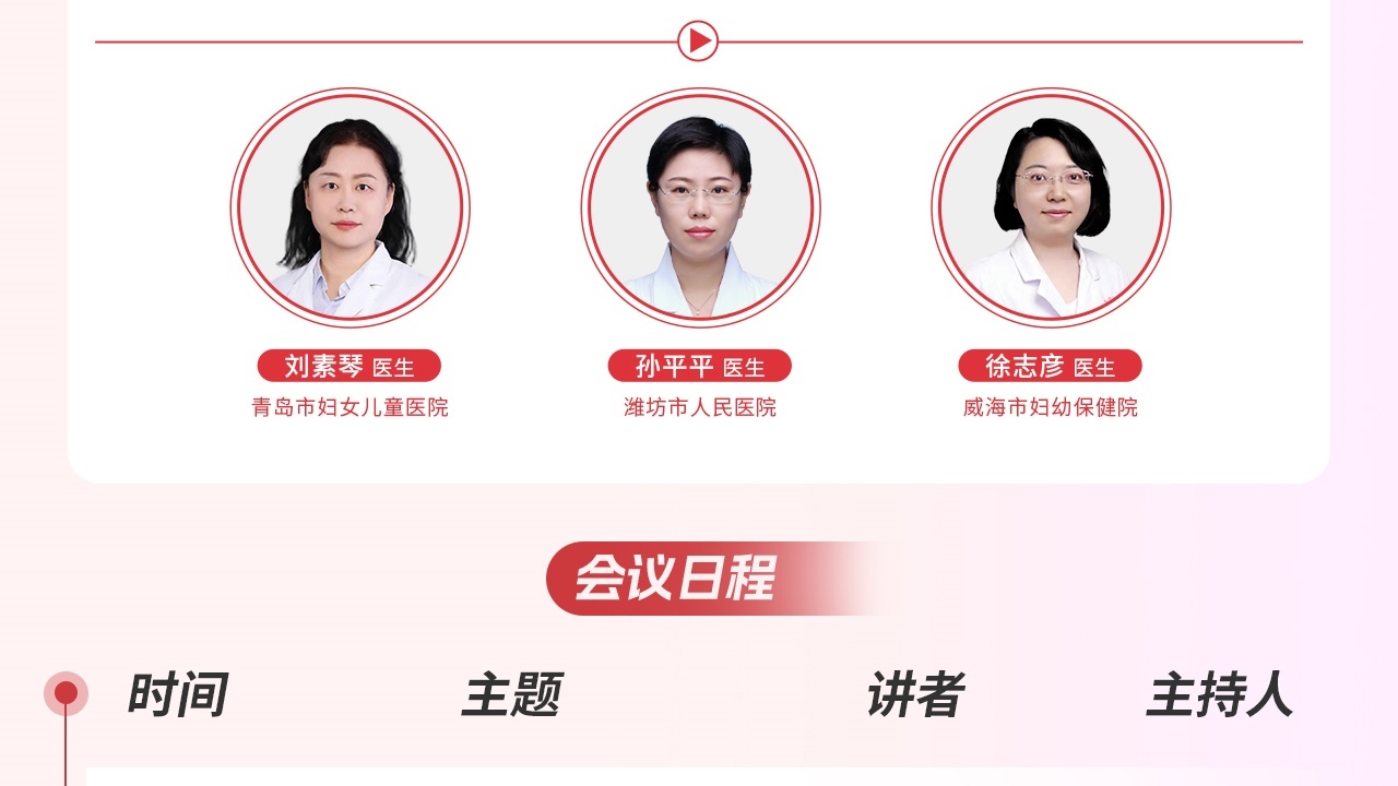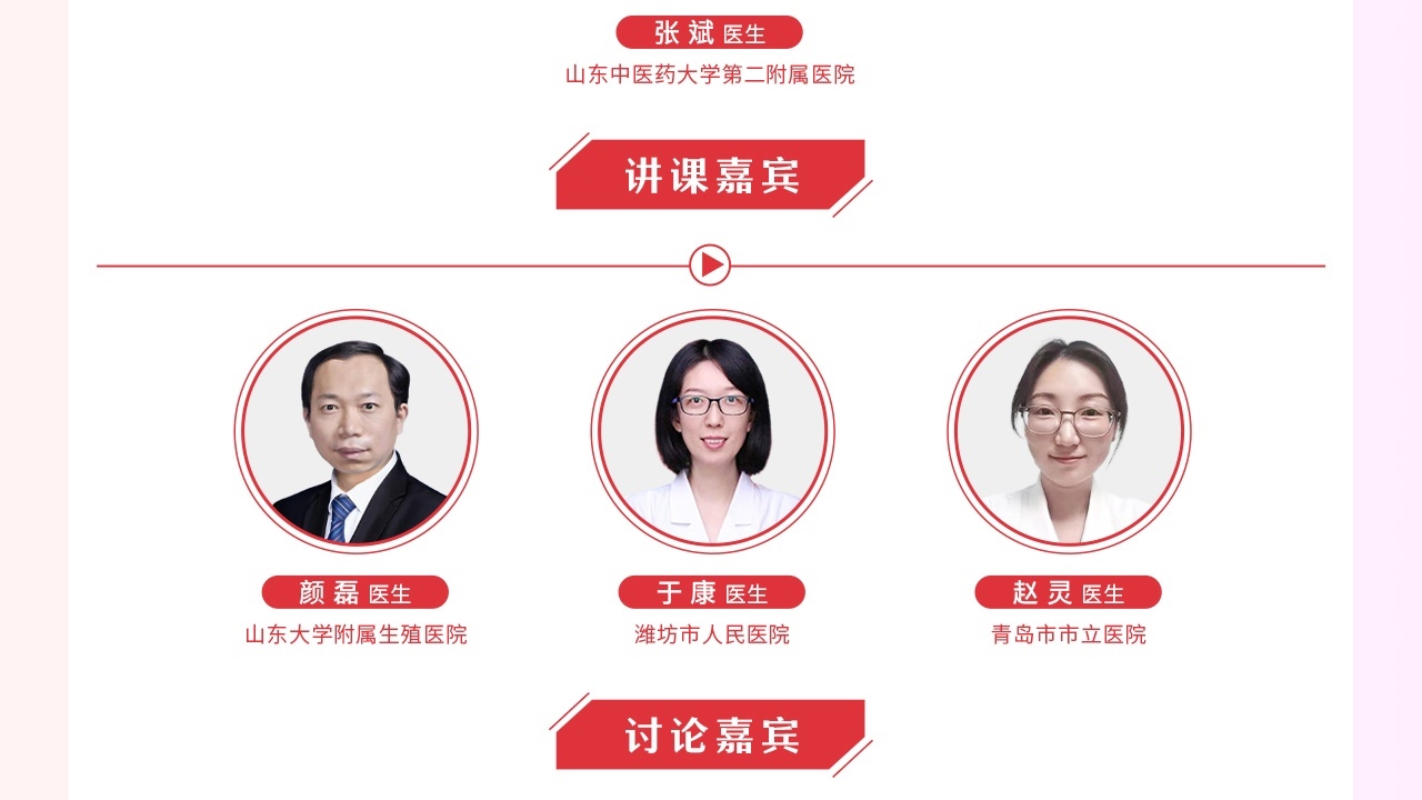 本期直播由青岛市市立医院刘海宁医生担任大会主席,由山东中医药大学第二附属医院张斌医生主持,山东大学附属生殖医院颜磊医生、潍坊市人民医院于康医生、青岛市市立医院赵灵医生分享科普讲座,青岛市妇女儿童医院刘素琴医生、潍坊市人民医院孙平平医生、威海市妇幼保健院徐志彦医生共同为大家答疑解惑,敬请关注。