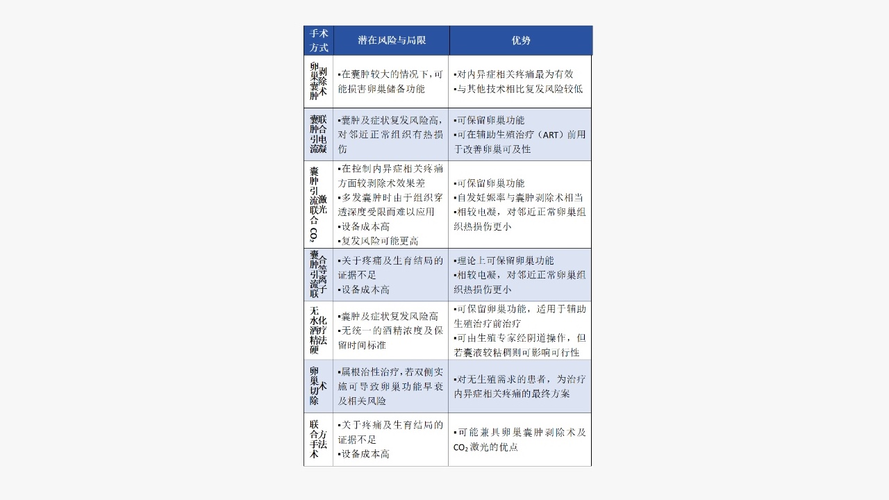 ▪术式选择要点:目前手术被视为症状性子宫内膜异位症的首选疗法。研究显示,囊肿切除组的复发再手术率显著低于其他手术方式,妊娠率更高。临床常用的外科治疗方式如下表。