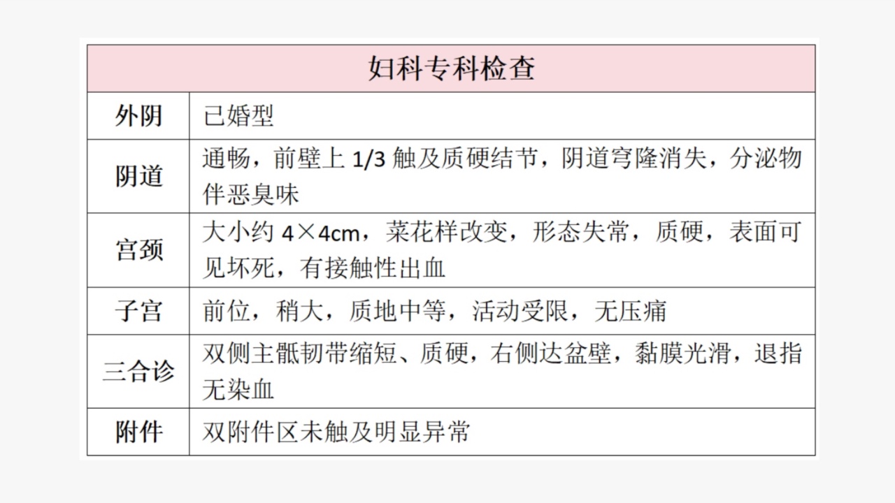 2022-10-29外院盆腔MRI:①子宫内膜及宫颈区病变,考虑恶性肿瘤性病变(宫颈癌、子宫内膜癌;宫颈癌累及子宫中下段);②子宫肌层多发结节影,考虑肌瘤伴部分变性,不除外其他病变,部分转移瘤待排;③左侧耻骨上支近耻骨联合处、右侧髋臼异常信号,提示骨转移。
