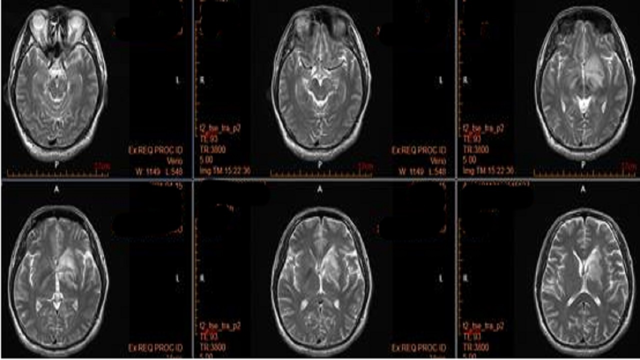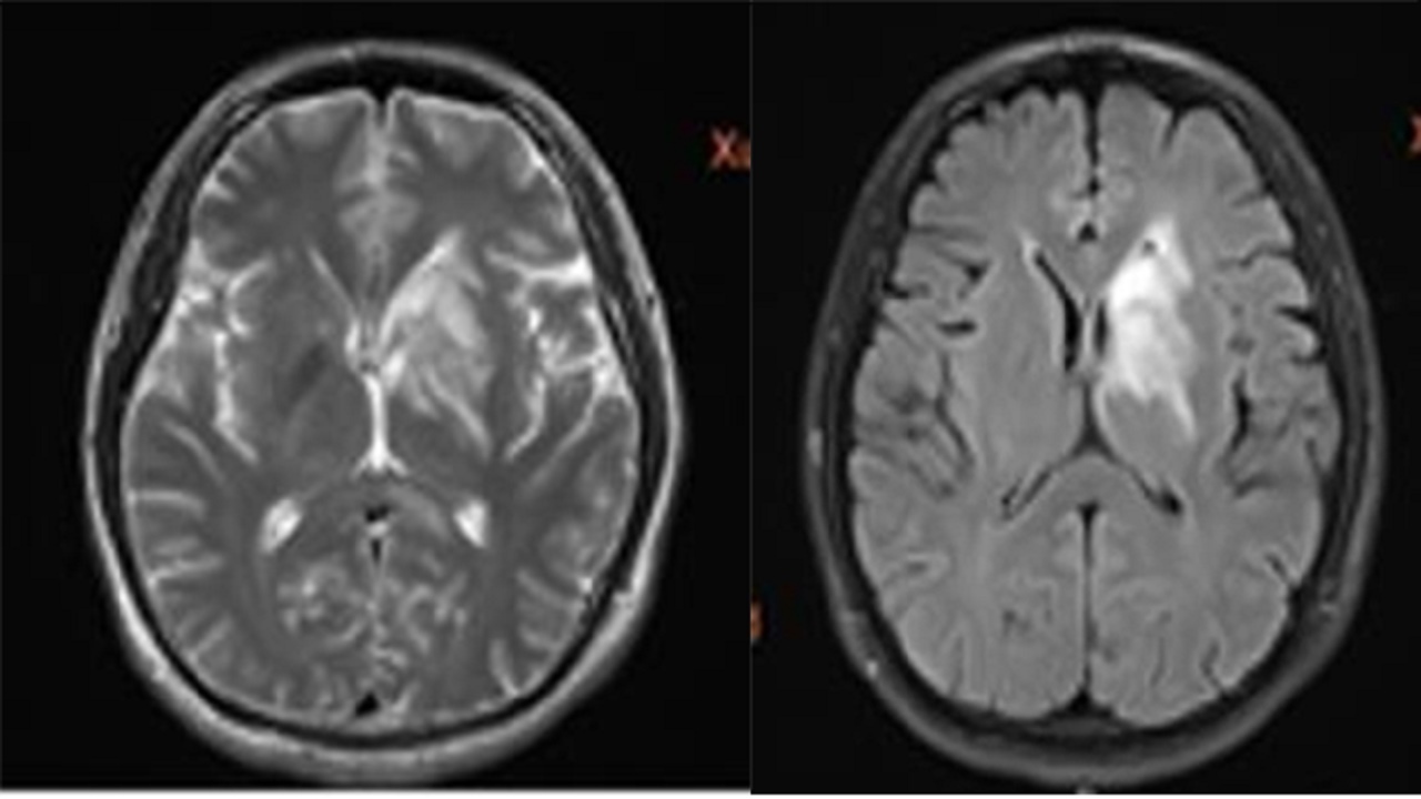 头颅磁共振平扫加增强:中脑、双侧内囊后支、胼胝体、右侧丘脑、左侧基底节区多发异常信号,炎性脱髓鞘可能。