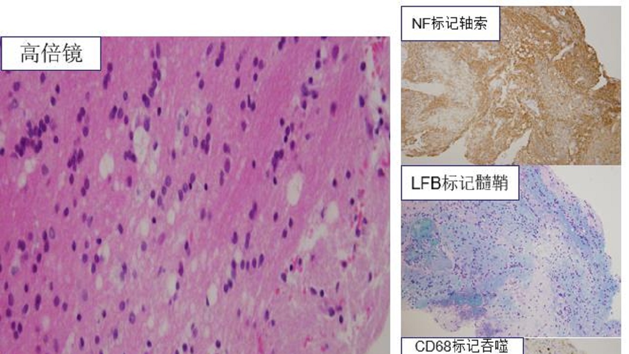 病理诊断:冰冻送检及另送(左侧脑室旁头病变组织)镜下见少许基底节区灰白质组织,局部结构疏松,散在点灶状的髓鞘及轴索脱失伴吞噬细胞浸润,周围组织内可见活化的及星形胶质细胞反应性轻度增生,小血管周围多量以T细胞为主的淋巴细胞浸润,淋巴套袖形成,结合临床及免疫组化结果,考虑为炎症性改变,符合免疫介导的小血管炎。